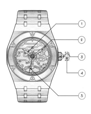 Nastavitev časa: Povlecite krono ven v položaj 4. Obrnite krono, da nastavite kazalce ur in minut. Ko je nastavljeno, potisnite krono nazaj v njen normalni položaj.